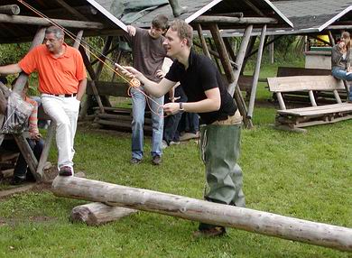 Daneben ebenfalls bei allen fünf Veranstaltungen bisher mit dabei: Fisch im Netz - der Angelspezi aus Arnstadt, u.a. mit Orvis, Scierra, Ron Thompson, EXORI, Cortland und Greys. Die große Wurfbahn war wieder ausgerollt und so wurden dort, wie auch auf der gesamten großen Wiese an allen in Frage kommenden Plätzen den ganzen Tag über und ohne Pause die Ruten geschwungen. Besondere Höhepunkte auf der Wurfwiese waren die LOOP Zweihand-Wurfvorführungen mit Stephan Dombaj (siehe links) und die Trickwurf-Demos mit der Gespließten mit Matthias Meyer. Neben den Vorführungen lt. Programm konnten die Besucher den ganzen Tag über mit den Instruktoren fachsimpeln, das Fliegenwerfen üben und Geräte ausprobieren. |