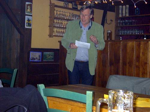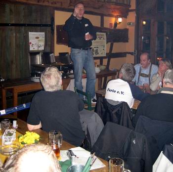 Gleich an der Tür fängt Thomas uns ab. Für „Hallo!“, „Schön, dass ihr da seid!“ usw. bleibt gar keine Zeit, stattdessen: „Guckt mal, wer da ist! Da hinten, in der Ecke!“ – Unsere Blicke schweifen durch den Raum, und tatsächlich – da ist er: NidRb leibhaftig, in bester Laune, ganz ohne Verbände und ohne Krücken. Statt sich mittels eines fahrbaren Infusionsgestells zu nähren, nimmt er alkoholhaltige Getränke zu sich. |