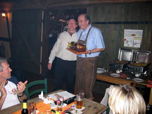 | Von Nummer 2 weiß ich, dass es Fotos gibt: Als Birgit und Marco als Repräsentanten des Münchner Fliegenfischerstammtisches unser aller Thomas mit einer Krachledernen beschenkte, als unser ganzer Haufen einstimmig „Ausziehen! Ausziehen! Ausziehen!“ skandierte, als Thomas dann in besagte Krachlederne schlüpfte – da war der eigentliche Höhepunkt erreicht. Der Brauhof wurde zur „Moulin Rouge“ der internationalen Fliegenfischerwelt, mit „Strippin’ Big Tom“ auf der Bühne vor johlendem Publikum. Sagenhaft. Vergesst Josephine Baker. | ![]() |