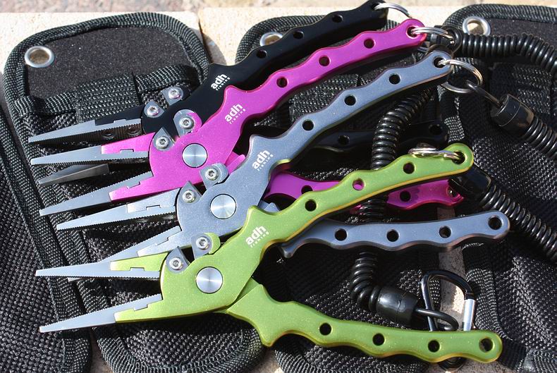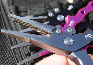Schon beim ersten Handhaben bemerkt man die erstklassige Verarbeitungsgüte dieser Zange: sie liegt schön geformt und leicht in der Hand, die Schneiden des Clips und die Verzahnung der Backen fügen sich beim Schließen absolut 100%ig exakt und ohne Spiel zusammen und der Federdruck im Mechanismus der Hauptachse wurde exakt bemessen, nicht zu schwach und nicht zu stark. Die ADH Zange ist korrosionsgeschützt und voll salzwassertauglich, sie kann eingesetzt werden als Hakenlöser, zum Widerhaken andrücken und zum Schneiden von Angelschnur & Vorfächern. Hergestellt aus Flugzeugaluminium und gefertigt auf CNC Maschinen mit geringsten Toleranzen verfügt die Zange über geschraubte und daher austauschbare, gezahnte Klemmbacken und Clipper-Schneiden aus Karbonstahl, die nicht nur Angelschnüre, sondern auch Titan- und Stahlvorfächer schneiden können! |