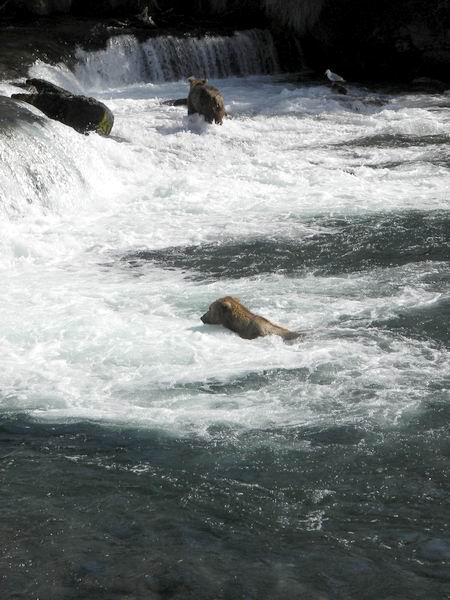 Wir landeten mit dem Wasserflugzeug von King Salmon aus und wurden gleich von Bären am Seeufer begrüßt. Eine Park Rangerin gab uns eine Einweisung auf den Umgang mit den Bären und schon machten wir uns auf den Weg zu dem Wasserfall an dem die Bären den Sockeyes nachstellten. Auf dem Weg haben wir ordentlich Lärm gemacht, wie es uns beigebracht wurde. Den ersten Bär Kontakt stellte eine Mutter mit drei Jungen dar, die wenige Meter vom Weg entfernt döste. Wir haben sie durch einen Bogen auf der anderen Seite des Weges umgangen. Eine Gruppe Japaner war weniger vernünftig und wurde von den Rangern bei einem Abstand von 8 Fuß von den Bären gebeten die Mutter doch endlich in Ruhe zu lassen. Am Wasserfall erwartete uns ein beeindruckendes Naturschauspiel. Einige Fliegenfischer haben im Fluss bis auf ca. 20 m an die Bären herangefischt. „Bewaffnet“ mit Bear-Spray ist das meiner Meinung nach "mutig". Bären beim Fischfang |