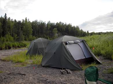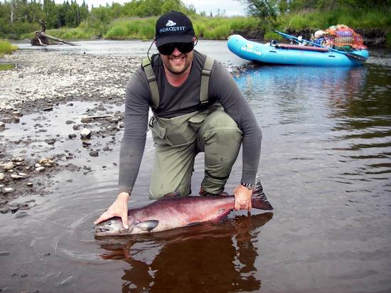 Das Camp konnten wir noch im Trockenen abbrechen, dann begann es zu regnen. Bindfäden. Nun ich stecke in einer Wathose und Watjacke, der Rest des Krams ist entweder wasserresistent oder wasserdicht verpackt. Der erste Stop des Tages beschert mir drei Regenbogenforellen (die Größte ca. 40 cm), davon eine auf ein Mäuschen an der Oberfläche. Dabei ist natürlich auch ein Fisch, den ich vergeige, weil ich mein Vorfach nicht auf 0,25 mm verstärkt habe, wie ich es eigentlich sonst tue, wenn ich Streamer fische. Wie das so ist war das die stärkste Raini, die ich auf der Tour gesehen habe. Dann wird in einer Regenpause, die genau dafür reicht, das Camp aufgeschlagen. Die Stelle ist toll, ein Bach fließt mit dem Deshka zusammen. In der Strömung des Baches verliere ich am Abend noch einen Lachs, weil ich ihn nicht mit letzter Konsequenz drille. Das Camp bleibt für zwei Nächte bestehen. Gleich der nächste Morgen bringt mir wieder einen King ein. Diesmal ein Fisch von ca. 12 Pfund. Joe fängt mit dem Wobbler einen 30 Pfünder. Es soll sein einziger Lachs bleiben. |