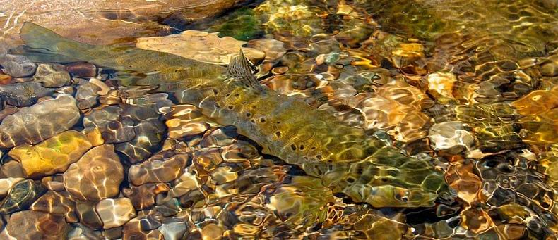 Ich stehe gebannt auf der Kiesbank, abgestützt auf meine Fliegenrute und beobachte den Lauf. Dort, auf gleicher Höhe zu mir, unter dem Ast verdeckt, bewegt sich etwas. Es sieht sich an, als ob eine Geisterhand von unten das Wasser aufwirft. Minutenlang ist alles wieder leblos. Und dann erneut die stille Bewegung, welche mich als Angler erregt. |
