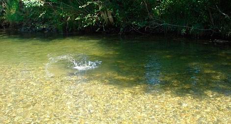Es sind Stelen, geduldig und gekonnt aufeinander geschichtete Bollersteine, die auf Distanz wie Silhouetten von Menschen aussehen. „Robin Beach“ ist für mich eine Art Refugium, ein authentischer Ort unberührter Natur. Fast fühle ich mich gehemmt, „unser“ Geheimnis zu lüften... Wie oft habe ich mich hier mit der Nymphe abgemüht, bis wir durch Zufall entdeckten, dass offensichtlich einzig die Trockenfliege gefragt ist. Es gibt in diesem Lauf Unterstände, wo die Forellen regelrecht zu nisten scheinen. Wenn du eine ans Land gezogen hast, geht bereits die Nächste in Stellung. So haben Antoine und ich im Hochsommer 07 bei extrem niedrigem Wasserstand und 35 Grad am gleichen Ort über die Mittagszeit vier Bachforellen mit den Maßen 38 bis 43 cm geholt. Mein Sohn findet dann trotzdem Muße, mit großen Kieseln ein Becken zu stauen, um die Fische dort vorübergehend zu verwahren und zu fotografieren. Anzahl