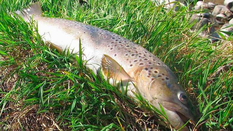 Antoine gibt steten Gegendruck. Wenn der Fisch ruhig ist, versucht er ihn aus der Tiefe hervorzuschleppen. So geht das hin und her. Nach zwanzig Minuten bittet er mich zu übernehmen, „mein Handgelenk, ich kann nicht mehr“ stöhnt er. Regelmässig recken wir unsere Hälse nach unten, um ihn zu erkennen. Die Rinne muss tiefer als zwei Meter sein, denn wir sehen den Boden nicht, selbst bei diesem kristallklaren Wasser. Wir waren uns einig, dass die einzige Chance den Fisch zu besiegen, darin bestand, ständig Druck auszuüben, ihn zu ermüden und dies mit äusserster Sorgfalt. Wie landet man eine Forelle von einer Brücke aus, rund acht Meter über dem Wasser? Antoine hatte die Antwort, zumindest war es eine Idee. „Halte mal die Rute und gib mir deine Orvis, ich versuche was von unten“. Dort angekommen begann er mit meiner Fliege in die Richtung des angespannten Vorfachs zu werfen. Nach etwa drei Versuchen klappte es. Die Flieeine Äsche! Wir staunten nicht schlecht ob dem Fang. Eine kapitale Seeforelle war es. Vermutlich hatte sie den Weg vom See, über die zwischen Fluss und See mustergültig angelegte Fischtreppe hinunter gefunden. |