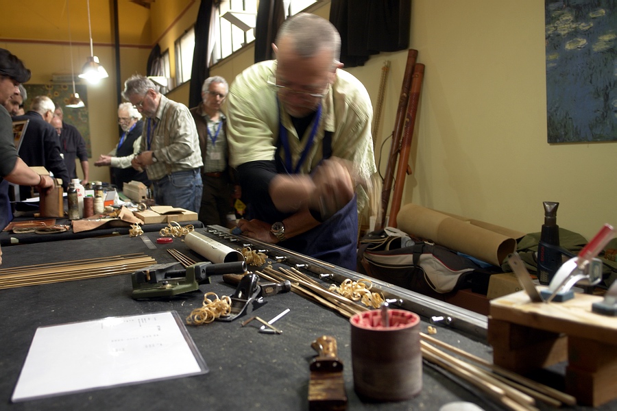 Im anderen Teil der Halle waren einige Werkbänke aufgebaut, auf welchen die verschiedenen Techniken vorgeführt wurden. Die Beschreibung der einzelnen Abläufe würde den Rahmen dieses Berichts ins unermessliche ansteigen lassen, so nur eine kurze Aufzählung der Themen ohne den Anspruch auf Vollständigkeit: Hexrod; RodDNA; Hohlbauen nach E. C. Powell; Schärfen und Polieren mit japanischen Steinen; Knotenbehandlung mit der Knotenpresse von Ortensio Ambrosini; Hohlbauen mit der «Hollowing Star» Methode; Wie schreibt man auf Bambus; Wie bereitet man die Hobelform für eine «Quad»; |