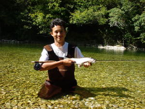 Was uns dieses Jahr besonders auffiel, waren die vielen schwarz gefärbten Bachforellen, die sich regungslos im seichten Wasser der Flüsse aufhielten und selbst, wenn man nach ihnen griff nicht die Flucht ergriffen. Der Wasserstand war erheblichgesunken und so kam es, dass sich in den wenigen tieferen Stellen die Fische nur so tummelten. Zu unserer großen Enttäuschung waren diese jedoch sehr beißfaul und ließen sich selbst mit kleinsten Trockenfliegen und Baetis-Nymphen an 0,08er Forfachspitze kaum zum Anbiß verleiten.Doch dann kam alles ganz anders...Wurf, gestrecktes Vorfach, kurze Drift - Biß. Die erste Äsche des Tages hat die Fliege akzeptiert und wird nach einem schnellen Foto wieder in die smaragdenen Fluten des Flusses entlassen. Wie gesagt - der erste Fisch des Tages - und viele weitere Fische und Eindrücke sollten folgen. Etwas weiter stromab, unterhalb eines Wasserkraftwerkes, fand sich ein großes, rauschendes Wehr. Dort, im schnellen Wasser zu fischen, ließen wir uns nicht entgehen. |