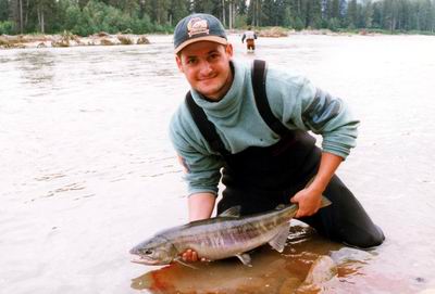 Noch während ich Schnur für den ersten Wurf von der Rolle zog, buckelte direkt unter der Rutenspitze ein beeindruckender Lachs - es muss Minuten gedauert haben, bis ich meinen Mund wieder zu bekam. Dann die ersten Würfe, schräg stromauf, zweimal menden wegen der starken Strömung und ohne Bewegung treiben lassen, bis die Fliege herumschwenkt. Rute etwas heben, um Hänger zu vermeiden und jetzt erst etwas Bewegung ins Spiel bringen und langsam einstrippen. Ich hatte mir alle Ratschläge unseres Guides gut gemerkt. 2. Tipp: Hör immer auf Deinen Guide! Schließlich lebt er hier, fischt hier seit Jahren und in British Columbia reagieren die Fische nun mal anders als in Wuppertal oder Hoyerswerda, auch wenn Du zu Hause der totale Profi bist. Der dritte (!) Wurf, die Schnur verzögert, etwas mehr Druck auf der Rutenspitze, Anhieb und während die Leine noch flußab schießt springt auf meiner Höhe ein Lachs. Dann ist der Druck weg und mir kommen fast die Tränen, natürlich nur vor Aufregung. Innerhalb der nächsten 50 Minuten verliere ich weitere 4 Fische, habe vom 32er bis zum 40er Vorfach hochgerüstet und bin dann endgültig an einem Fisch fest. |