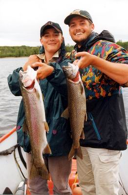 Da ich eigentlich nur mit der Fliege fische, legten wir zusätzlich zwei Fliegenruten mit Sinkschnur und stark beschwerten Fliegen in das quirlige Wasser des Motors. Während der heißen Tage war das Ergebnis nicht gerade berauschend, nur wenige Durchschnittsrainbows zeigten Interesse. Das änderte sich schlagartig, als sich mit einem Gewitter ein Wetterumschwung andeutete. Als erstes schlug die Downriggerrute aus, in der Tiefe meldete ein durchaus erwähnenswerter Fisch Protest an. „Fish on!“, auf diesen Ruf hatten wir schon lange gewartet. 5 Pfund, nicht gerade viel für einen Namaycush (Strichliste: Nr. 4!), aber für uns das Startsignal für verstärkte Bemühungen. Ganz nebenbei, frisch in der Lodge geräuchert: ein Gedicht! |