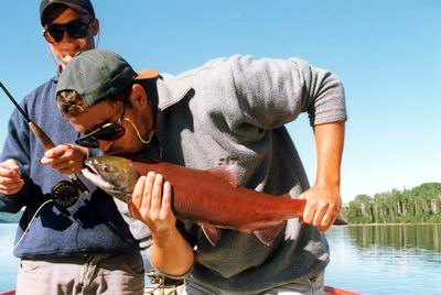 | In der Regel sind die laichbereiten Fische nicht mehr zu fangen, ganz im Gegensatz zu Rainbows und Dolly Varden, die am Einlauf auf Eier warten. Wenig Rotlachse, kaum Eier, da waren nicht viele Laichräuber zu erwarten. Dennoch konnten wir einige Dollies (Nr. 6!) um 1 Kg an die Fliegenrute bekommen. Während des Fischens kreuzten direkt vor unserem Boot die Rotlachse im klaren Wasser, hinter uns im Bach platschten die bereits aufgestiegenen gewaltig. Mehrmals legte ich die Rute zur Seite um dieses grandiose Schauspiel auf mich wirken zu lassen. | ![]() |