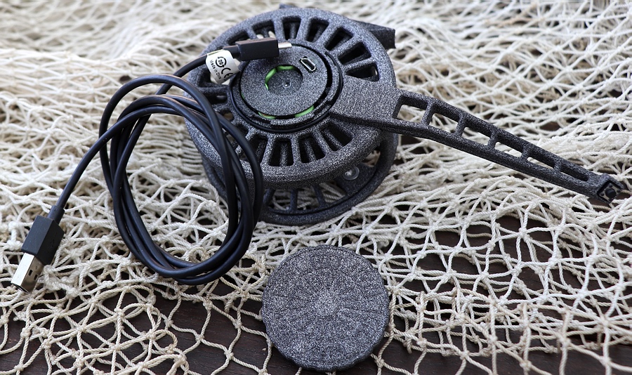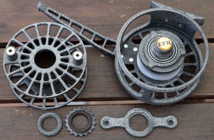 Fliegenrolle aus "Alumide" Kompositmaterial. Alumide ist ein Verbund aus