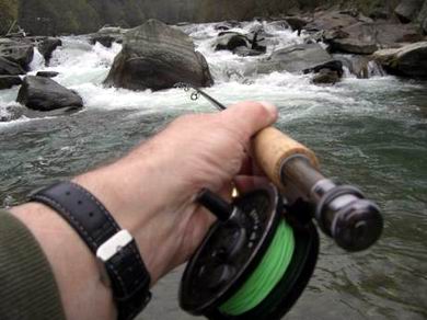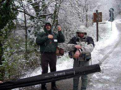 | Wir haben uns die Tagesscheine besorgt, und man bescheinigte uns, dass wir Deutschen wohl nicht richtig im Kopf sein könnten, bei einem solchen Wetter mit der Fliege zu fischen. Wir sind eben ein anderer Menschenschlag. Wir werden mit allen Witterungsverhältnissen fertig ;-) Wir werden den Einheimischen zeigen, was wir für Kerle sind. Im Schutz der Bäume, unter der Heckklappe des Kombifahrzeuges, wurden die Ruten zusammen gestellt und wir machten uns auf den Weg ans Wasser. |