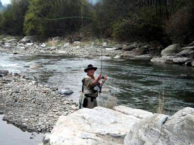 Er hat den Mut immer noch nicht verloren, er fischt unentwegt. Ich beobachte aus einem sicheren Versteck seinen Wurfstil, welchen er mit jedem Wurf verbessert. Es macht Freude, ihm beim Fischen zu beobachten. Wenn er jetzt noch die Fliege richtig führt und mit der Schnur den Kontakt mit einem möglichst Interesse zeigenden Fisch verspürt, dann wird er bald Erfolg haben. Manchmal musste ich ihn auch darauf aufmerksam machen, dass er nicht am Ufer der Fulda steht, sondern in der Etsch, wo schon so mancher Anfänger ein ungewolltes Bad genommen hat. Er befolgte meinen Rat und begab sich in Gefilde wo er einen besseren und sicheren Stand hatte. Jedoch wollten die Fische bei ihm nicht so recht beißen. Ich tröstete ihn und versicherte, er würde morgen bestimmt einen Fisch fangen. |