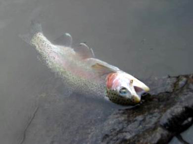 | Oben: Ich fischte im oberen Teil der Etsch und hatte dort eine schöne Stelle ausfindig gemacht, wo fast alle Fischarten vertreten waren. Eine wunderschöne Regenbogenforelle nahm meine unverwüstliche Schaumgumminymphe. |