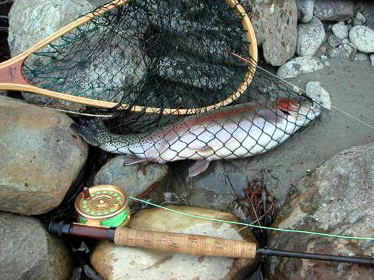 Olaf's fast unerschöpfliche Geduld zahlte sich nach fast vier Stunden aus, an einer Stelle, an der er eine große Forelle ausgemacht hatte. Er landete seine ersten beiden Regnbogenforellen mit der Fliegenrute. |