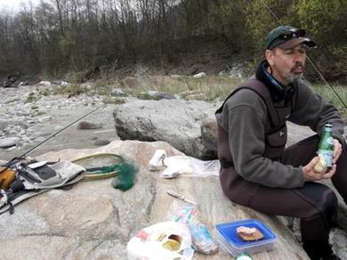 Es wurde reichhaltig gefrühstückt, denn wir wollten den ganzen Tag an der Etsch fischen. |