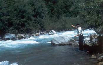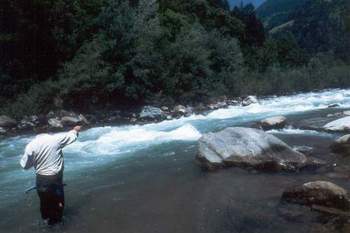 Es gibt jedoch bei uns eine wahre Vielfalt an schönen Gewässern, vom kleinen Gebirgsbach mit dem klaren Bergsee zum wild stürzenden Fluß. Foto links: R. Pegoretti beim Befischen der Passer. |