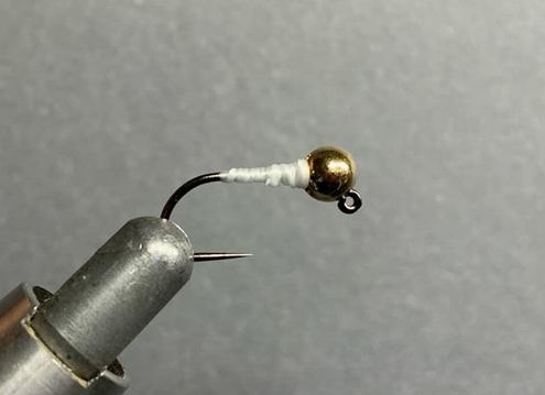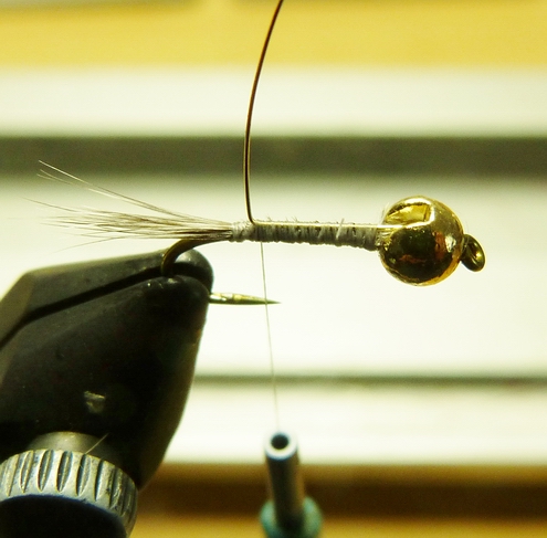 | 1. Kopfperle auf den Haken stecken | 2. Bleiwicklung aufbringen, mit Bindefaden überwinden und Grannen als Schwänzchen einbinden |