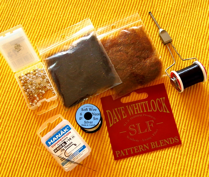 - Jig-Haken Grösse 12 - Tungstenperle 4 mm - GSP Faden weiss - Sekundenkleber - Grannen von Huhnfeder für Schwänzchen - Kupferdraht für Rippung - Hareline Krystal Dub für Körper - Neon-Orange Faden für Kragen Bindeschritte: |