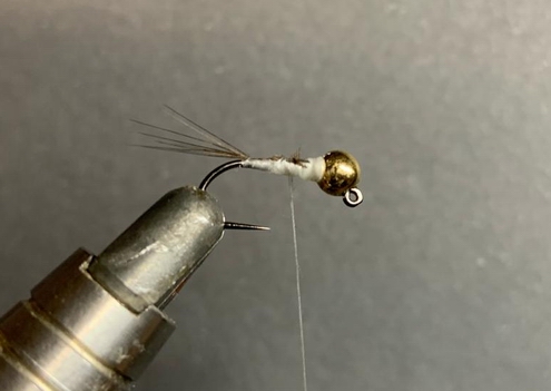 | (7) Nun wird die vorbereitete Partridge Feder so eingebunden, ... | ... dass die Fibern rechts und links abstehen und die Beinchen bilden. Überstand wieder so knapp es geht abschneiden und die Fliege abschließen. | (8) Zu guter letzt eine Schicht UV Resin auf den Thorax auftragen und aushärten. Dabei darauf achten, das Harz auch auf den Draht als auch auf die Perle zu verteilen, da sich die Schicht nicht gut mit dem Latex des Scudback verbinden kann. |