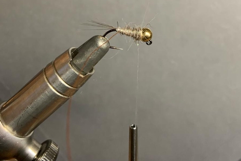Je nach Gewässer findet die Nymphe in der Größe 6 bis 12 ihren Platz in vielen Fliegendosen. Der Urvater dieser Nymphe ist der vielen bekannte Fliegenbinder Rene Föllmi aus der Schweiz. Er bevorzugte, im Gegensatz zu meinem Dubbing aus Kaninchenhaaren, ein Dubbing aus der Unterwolle vom Seehund. Auch beim Körper wendete er die Schlaufentechnik an. Hier zwirne ich nur das Dubbing um den Faden. Neben unserer Forelle konnte ich in der Vergangenheit auch Barben und Nasen von meinem Muster überzeugen. Materialien