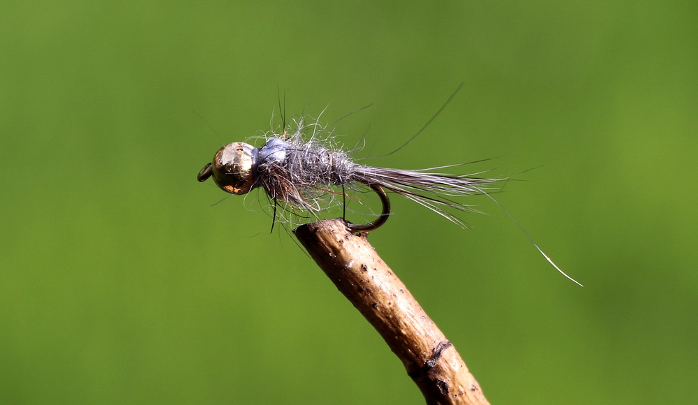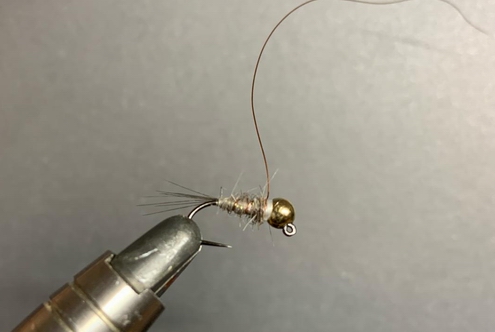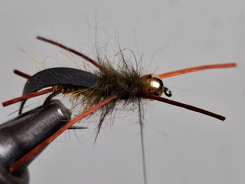 Vor Jahren traf ich einen jungen Fliegenfischer am Forellenbach, der, obwohl neu am Wasser, beim Nymphenfischen recht erfolgreich war. Er fischte eine einfache, kleine, braune Nymphe, die ich am Bindetisch kopierte. Und siehe da, im Wasser blieben mehr Forellen hängen als vorher. Im Lauf der Jahre habe ich hier und da etwas hinzugefügt, aber sie ist „die Braune“ geblieben. Warum sie das ganze Jahr über fängt, kann ich gar nicht sagen. Typisch für meinen Niederungsbach, gibt es keine besonders vorherrschende Insektenart. Sie ist also nicht speziell für eine bestimmte Situation ausgelegt. Ich fische sie mit Gold-, Kupfer- und Silberkopf. Letzterer bringt auf die Jahre gesehen gefühlt mehr Fänge als die anderen Farben, egal, wie die Bedingungen vor Ort sind. Material:
