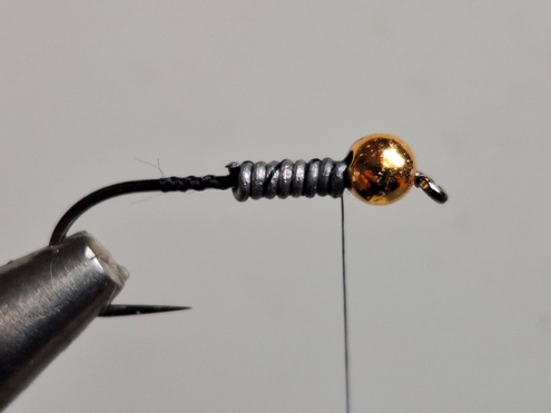 | (1) Zunächst wird die Messingperle auf den Haken gefädelt. 6 Wicklungen Bleidraht werden auf den Hakenschenkel gewickelt und soweit es geht in die Perle geschoben. | (2) Der Faden wird nun hinter dem Blei angewickelt und bis kurz vor dem Hakenbogen möglichst gleichmäßig geführt. Die Biots werden gegeneinander gelegt, sodass die natürliche Krümmung ein V förmiges Schwänzchen bildet eingebunden. Die Überstände sollten Bündig am Beginn des Bleidrahtes abgeschnitten werden. | (3) Die Biots werden nun, wieder möglichst gleichmäßig, in Richtung des Hakenöhrs eingebunden. Hierbei fixere ich dann auch den Bleidraht und bilde einen möglichst fließenden Übergang von Blei zu Haken mit dem Bindefaden. Genau an diesem Übergang binde ich nun den Kupferdraht an der Oberseite des Hakens nach hinten ein. Zu diesem Zeitpunkt hat man die letzte Gelegenheit für kleinere Korrekturen falls sich am Hinterkörper Unsauberkeiten gebildet haben. Diese verstärken sich nämlich extrem durch die Kupferwicklung. |