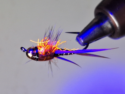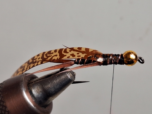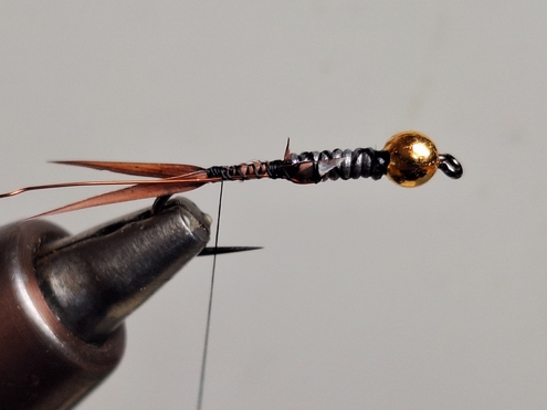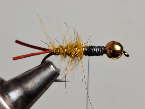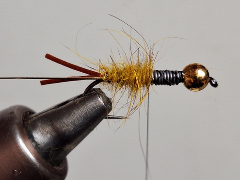 Haken: # 8-10 Bindefaden: hier Schwarz; VEEVUS 10/0 Kopfperle: Tungsten, geschlitzt, Gold, 4,0 (Baker) Ggf. Beschwerung: Bleidraht Schwanz: Biot, braun Dubbing: UV Unibody Dub (von Baker) Hinterkörper: UNI Stretch; schwarz Rippung: Kupferdraht Hechel: Henne Flügelhülle: Marbled Latex (Heger) oder Nyph-Rap, 3 mm, Fulling Mill oder ähnliches Bindeanleitung: