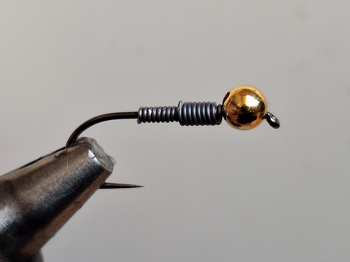 | 1. Perle auf Haken schieben, Hakeneinspannen und ggf. noch eine Lage Bleidraht | 2. hinten 2 Biots einbinden |