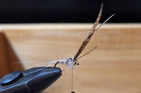 | 6. Dubbing etwas dunkler mischen und wickeln, dass die Beine schön abstehen. | 7. Knoten - Fertig!