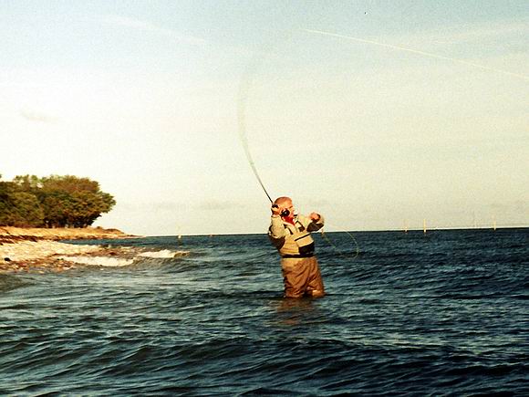 Vorsicht ist das oberste Gebot beim Verhalten der Meerforelle. Sie ist sehr scheu, wobei sie im glasklaren Wasser jede Bewegung, oder jeden Schatten wahrnimmt. Auf den geringsten Gefahrenverdacht reagiert sie sofort mit der Flucht. Dementsprechend sollten wir uns auch beim Angeln verhalten. Erst veruchen wir unser Glück vom Ufer aus, bevor wir uns vorsichtig ins Wasser wagen. Um die Futterstellen der Meerforellen zu erreichen, benutzen wir schwimmende Shooting Head Schnur mit Intermediate Tip, der eine Sinkgeschwindigkeit von 3 - 5 cm/sec hat. Auf die Vorfachspitze aus Fluorcarbon binden wir zwei Köder mit dem „Freien Knoten“ an, damit sie sich im Wasser reizvoll bewegen und die Schwimmbewegung der echten Garnele nachahmen können. |