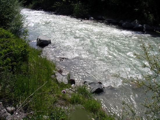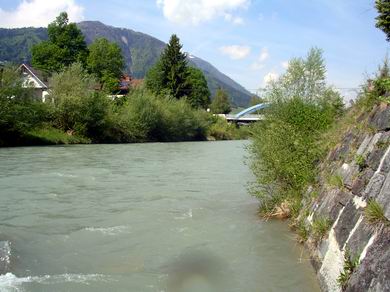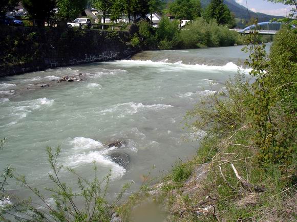 Jetzt hatten wir ja schon Routine im morgendlichen Ablauf. Sepp war wieder pünktlich da, um mit Rainer den Kurs fortzuführen. Tags zuvor hatten sie nur am stehenden Auslauf der Valentin Wurfübungen gemacht, heute wollten sie an die Gail, ans Wehr beim Sägewerk, wo ich gestern morgen so gut gefangen hatte. Ich beschloß, heute morgen mein Glück an der unteren, begradigten Gail zu versuchen, also vor der Gailbrücke links flußabwärts durch das Wohngebiet und ca. 1 km unterhalb von Kötschach. Das Wetter war wieder sehr schön, die Gail jedoch immer noch vom Schmelzwasser leicht angetrübt mit respektvoller Strömung / Wasserstand. |