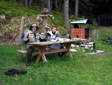 Hier noch einige Impressionen dieses schönen Tages: Links Sepp und rechts Stefano beim Fischen am Angerbacheinlauf => Unten links: Angerbacheinlauf in den Grünsee von oben. Unten rehcts: Ausklang mit lecker Bier und Grillsteaks an der Grünseehütte. Tja und dann kam ein guter Regenguss, wir schafften es noch gerade so zum Auto. Nix wie runter nach Kötschach ins Hotel, die Sachen zum Trocknen aufgehängt und schön warm duschen, es war doch recht frisch geworden oben am See, ca. 10 Grad. |