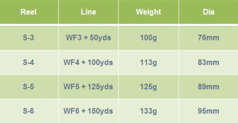 Der Spulenwechsel geht schnell und einfach: hierzu muss nur auf den "Schnellwechselknopf" in der vorderen Spulenmitte gedrückt werden, dann lässt sich die Spule abziehen. Die Schnurkapazität der Spoke S-6 ist sehr gut und für die Rollengröße angemessen. Im Test passten locker eine WF6F und rd. 120m 20lbs Standard-Backing auf die Spule. Unter Verwendung von Gelspun-Backing lässt sich auch eine WF7 noch mit ausreichend Nachschnur fischen. Die Rolle besitzt eine schmale Großkernspule mit großem Durchmesser und dadurch die geschätzten Vorzüge von Großkernfliegenrollen, z.B. einen geringeren Anlaufwiderstand, einen stets relativ gleich bleibenden Abzugswiderstand und eine rasche Schnuraufnahme. Die Größendimension und das Gewicht der Rolle im Verhältnis zur vorgesehenen Schnurklasse und den Einsatz an entsprechenden #6er Einhandfliegenruten empfinden wir als gut passend und stimmig. |