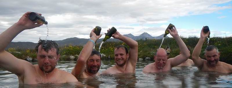 In der Nacht hört der Regen auf und am nächsten Morgen begrüßt uns ein sonniger Tag. Wir machen uns sogleich ans Lager abbauen und tragen alles wieder an die Mündung hinunter, zum heutigen Bootstransfer. Heute steht mit einem Bad in den 37°C heißen Quellen ein weiteres Highlight der Reise auf dem Programm. Dringend nötig haben wir es ja alle. Das Boot kommt, man hatte sich bei der Ermittlung des Flut-Höchststandes jedoch um zwei Stunden verschätzt – und so passiert im trüben Wasser das Unvermeidliche. Das Boot steuert zu weit nach links an der Flussmündung und fährt sich auf einer Kiesbank bei einsetzender Ebbe und mit Unterstützung des plötzlich drehenden Windes so richtig schön fest. Erste Selbstrettungsversuche seitens des Käptns mit Hilfe des Beibootes und der Ankerwinde fruchten nicht, ebenso wenig der Versuch, uns paddelnd mit dem Beiboot, dessen Außenborder natürlich im passenden Moment versagt, das Seil zum Ziehen zu bringen. Immer wieder treiben Strömung und ablaufende Ebbe das kleine Gummiboot raus aufs Meer. Uns läuft die Zeit sprichwörtlich davon, denn in kurzer Zeit würde das Boot aufgrund der Ebbe so fest auf der Kiesbank liegen, das wir weitere 12 Stunden hier gefangen wären. Mit übermenschlichen Kräften schafft es der Skipper dennoch irgendwann, mit dem Seil zu uns zu gelangen und mit einer gemeinsamen Seilziehaktion und quasi auf den letzten Drücker gelingt es uns schließlich, das Boot in die tiefere Fahrrinne freizuziehen. Mit dem als Seilbahn umfunktionierten Gummiboot schaffen wir dann rasch Gepäck und Leute Schritt für Schritt aufs Boot und kommen nach noch mehrmaligen kurzen Aufsetzen und Grundkontakten schließlich glücklich und unbeschadet aus der „verhexten“ Mündungsbucht hinaus. Nach kurzer Fahrt gelangen wir zu den heißen Quellen, die auf einer Anhöhe liegen und einen atemberaubenden Blick auf die vor uns liegende, mit Eisbergen gefüllte Bucht bieten. Darin chillen mit einem kühlen Bier in der Hand - das ist einfach Weltklasse und Erholung pur! |