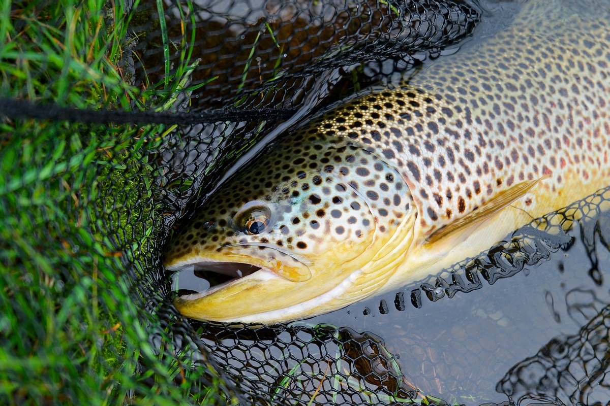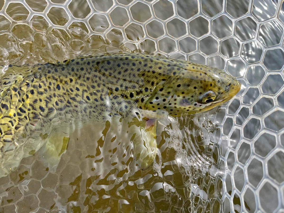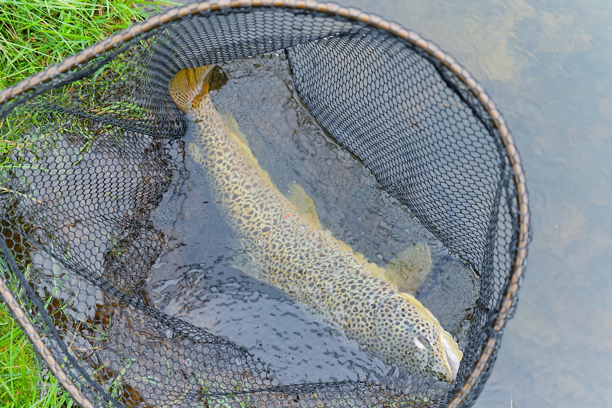 | Auf dem Rückweg zur Brücke versuchte ich es erneut an den gleichen Pools und wechselte dabei teilweise auch auf die andere Uferseite, da diese manchmal besser zum Fischen erschien. Als ich gegen kurz vor halb sechs wieder an der Brücke auftauchte, stand Manfred mit gebogener Rute direkt oberhalb der Brücke. Es war aber leider kein Lachs, der sich seine Ally’s Shrimp schnappte, sondern nur eine, vermutlich residente, Brown Trout mit 42 Zentimetern. Wir entschieden uns, den Fisch zur Bereicherung unseres morgigen Abendessens mitzunehmen. |