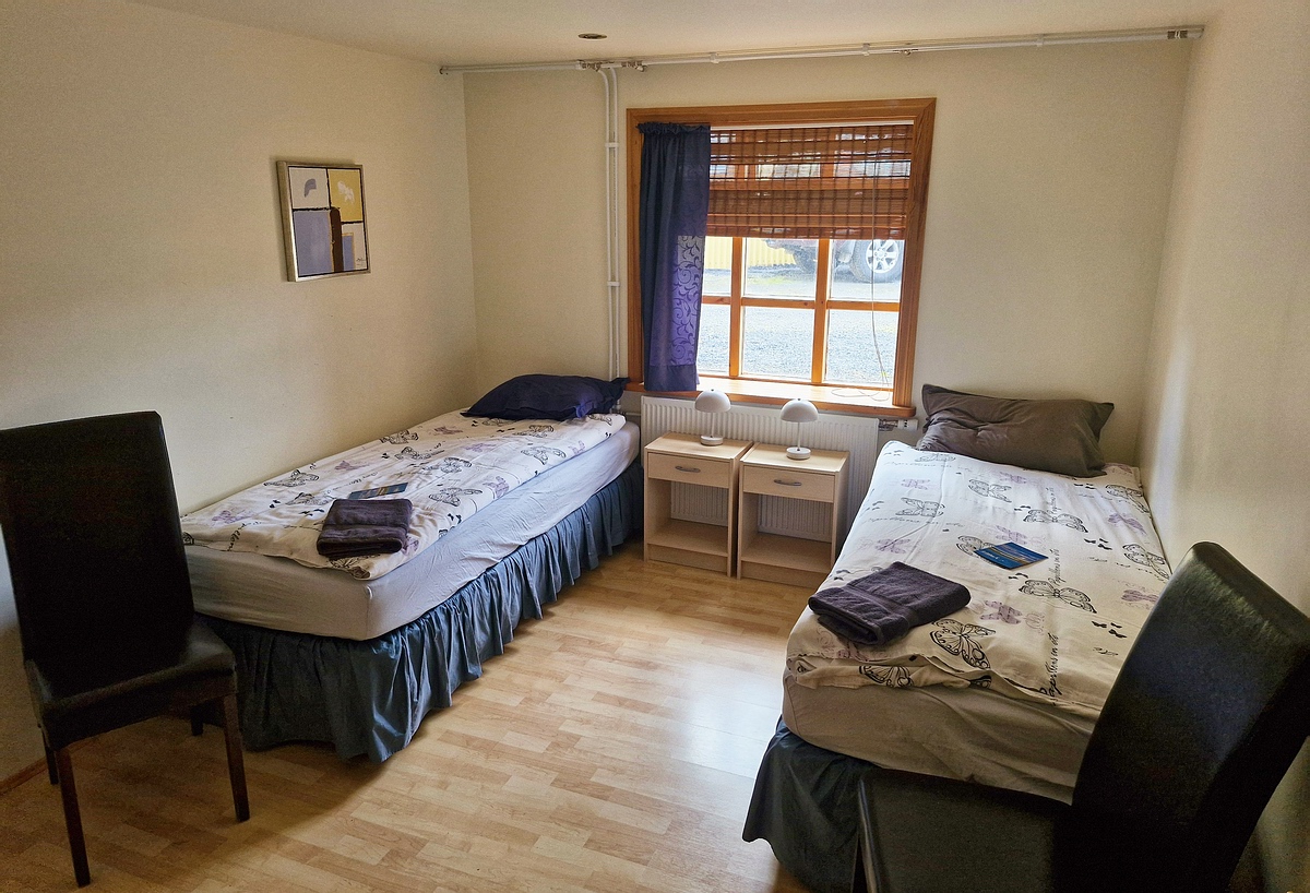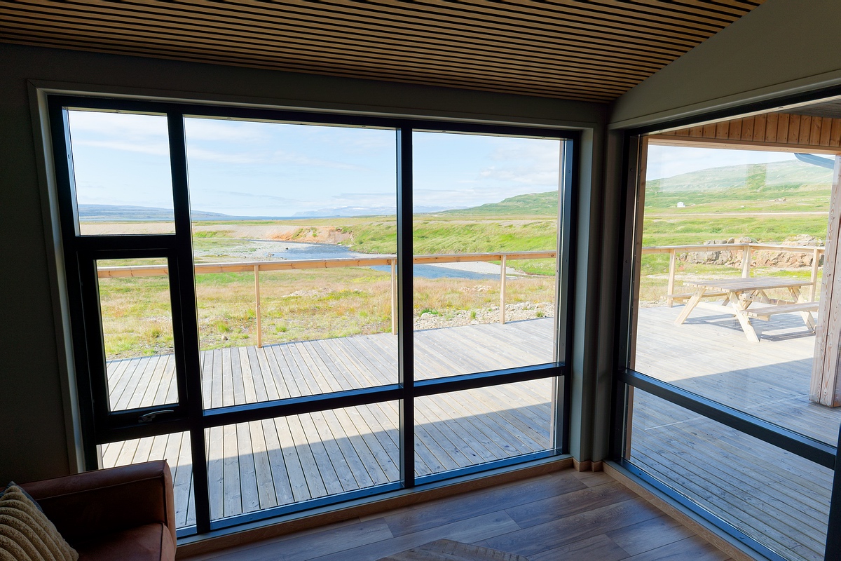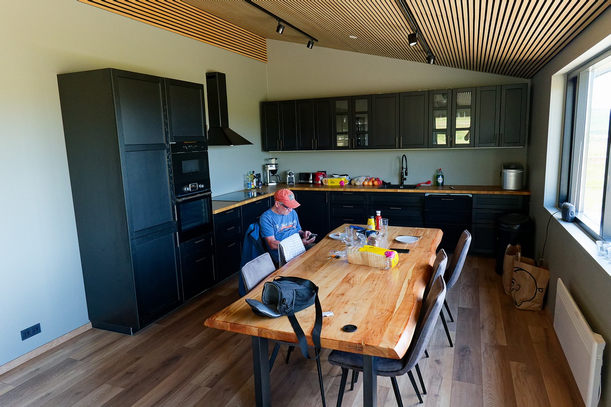 | Nach einer weiteren kurzen Pause an der Haukadalsá erreichten wir unsere Selbstversorger-Lodge an der Hvannadalsá nach insgesamt etwa vier Stunden Fahrt gegen 14:30 Uhr. Die erst vor ein paar Jahren erbaute Lodge ließ keine Wünsche offen: Die Küche war optisch sehr ansprechend und auch top ausgestattet, der Aufenthaltsraum war sehr gemütlich und hatte Panoramafenster mit Blick auf den Fluss und seine Mündung in den Atlantik. Wir hatten zu zweit vier Schlafzimmer (mit jeweils zwei Betten) und jeder ein eigenes Bad mit Dusche! |