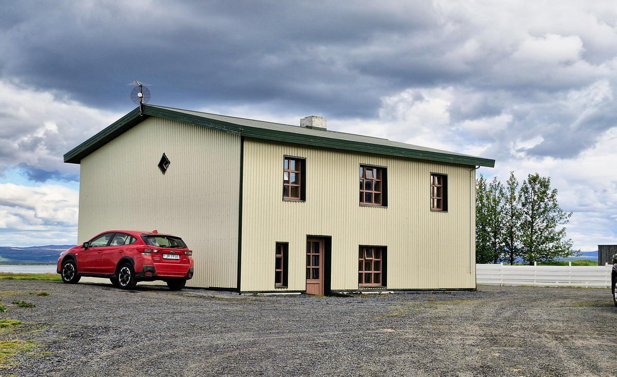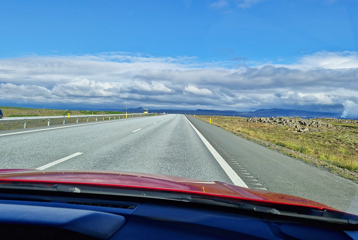 26.07.2025 Zusammen mit meinem ältesten Sohn holten wir Manfred um 10 Uhr in Augsburg ab. Danach ging es weiter zum Flughafen nach Erding, den wir kurz nach 11 Uhr erreichten und dort meinen Sohn verabschiedeten. Das Einchecken verlief problemlos und ich hatte mit 22,6 Kilogramm sogar erstmals weniger Aufgabegepäck als Manfred, wobei mein Rucksack sicher deutlich schwerer war. Beim Check-In lernten wir zwei Südtiroler kennen, die auf dem Weg zur West Rangá waren und unterhielten uns auch später noch angeregt mit ihnen. Wie meistens, wenn wir nach Island flogen, erfolgte der Abflug wieder mit einer guten halben Stunde Verspätung, die Landung in Keflavik war dafür wieder annähernd pünktlich. Nach einem ruhigen Flug erhielten wir unser Gepäck recht zügig und gingen nach einem sehr kurzen Vorzeigen unserer Desinfektionszertifikate zur Ankunftshalle. Dort wartete ein Mitarbeiter unseres Mietwagenverleihs bereits auf uns und einige weitere Kunden. Die Mietwagenfirma selbst lag ein paar Kilometer vom Flughafen entfernt und die jeweiligen Hauptfahrer wurden mit einem Shuttlebus dorthin gebracht. Aufgrund der bereits im Vorfeld online übermittelten Unterlagen (Führerschein und Personalausweis) erfolgte die Übergabe schnell und reibungslos. Mit dem Fahrzeug an sich hatten wir diesmal eher Pech, da der Subaru schon über 218.000 Kilometer auf dem Tacho hatte und man ihm das auch ansah. Zudem war der Wagen nicht besonders geräumig, was letztes Jahr, als wir ja größtenteils zu dritt unterwegs waren, zu einem echten Platzproblem geführt hätte. Nach der Entgegennahme des