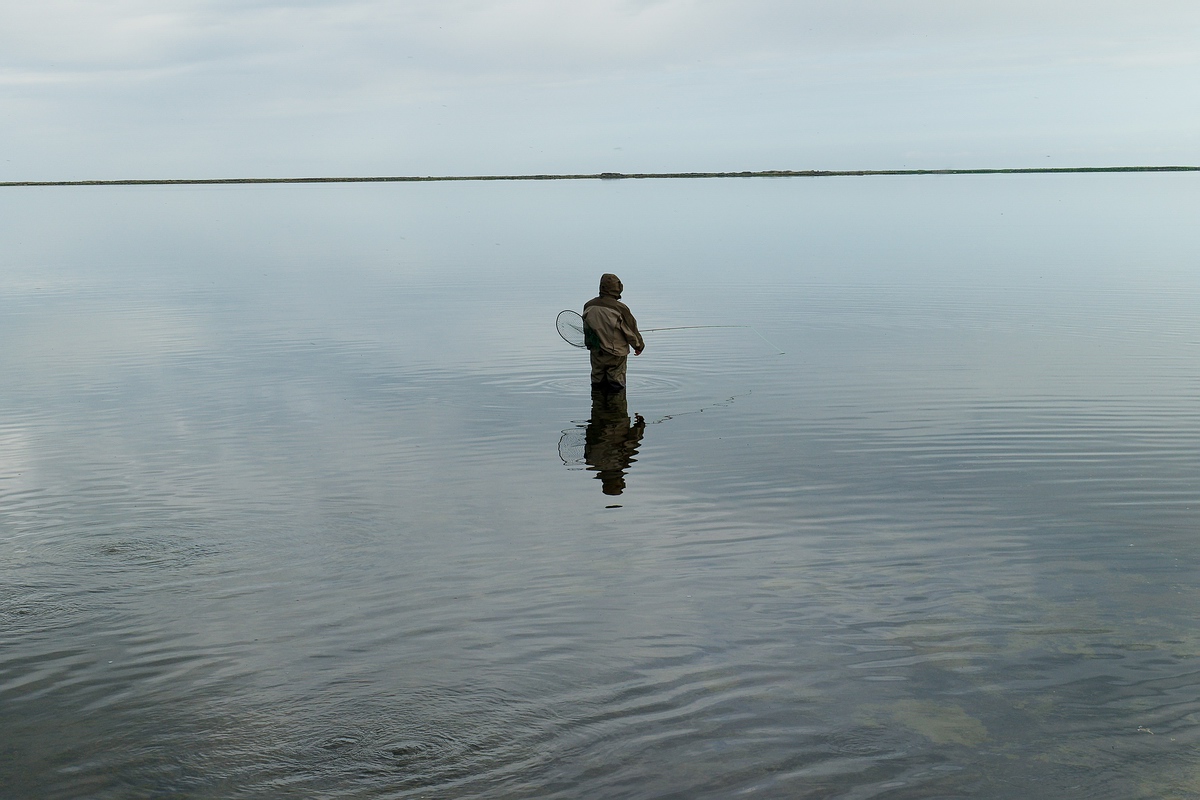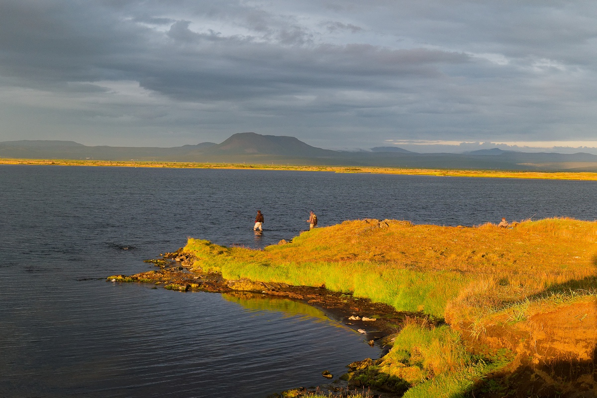 Gegen 21 Uhr watete ich zum letzten Mal in diesem Urlaub in den See hinaus und startete einen letzten Versuch mit dem Streamer auf Forellen. Natürlich blieb die „Black Dyrbittur“ am Vorfach und ich hatte bereits beim zweiten Wurf erneut einen Biss. Bedauerlicherweise blieb der Fisch aber nicht hängen und in der restlichen halben Stunde, die ich noch streamerte, tat sich nichts mehr. Manfred hatte in der Zwischenzeit bereits drei oder vier Arktische Saiblinge gefangen, die alle um die 50 Zentimeter und an die drei Pfund hatten. Ich wollte den letzten Abend auch noch gerne mit einem oder zwei Chars beschließen, bevor es dunkel wurde und versuchte es nochmals mit dem langsam gezogenen „Stimulator“. Der bescherte mir zwar schnell hintereinander zwei weitere Bisse, aber scheinbar war der „Stimulator“ so dicht behechelt, dass der Haken nicht vernünftig greifen konnte. Ich wechselte deshalb, trotz