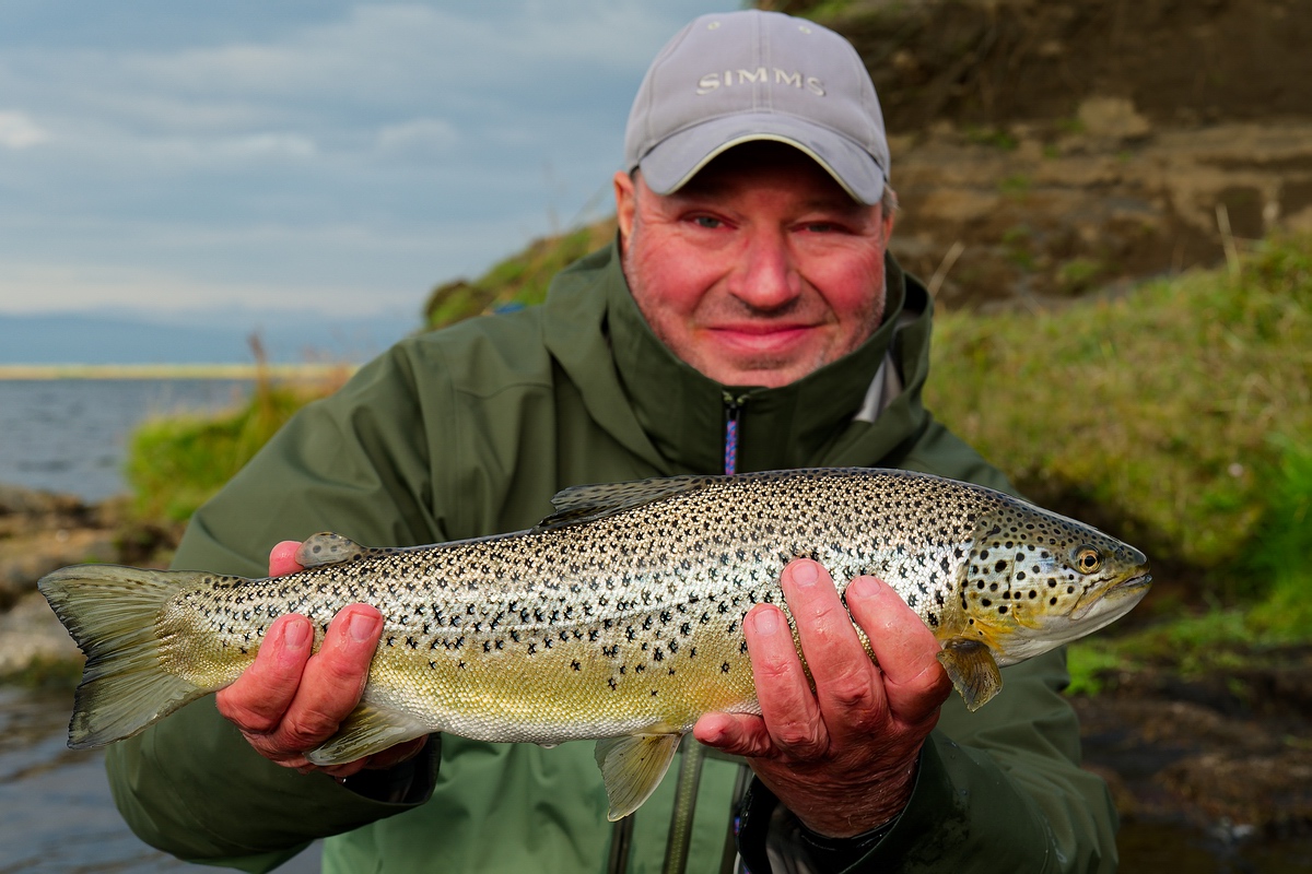 Anschließend versuchten wir es wieder weiter draußen im See auf Forellen, diesmal allerdings erstmal mit den 6er Ruten, mit denen wir auf Saiblinge gefischt hatten. Bei mir kam eine „Krókurinn“ zum Einsatz, Manfred band einen kleinen Kettenaugenstreamer mit Grizzly-Hechel ans Vorfach. Er hatte dann auch schnell den ersten Biss und konnte nach einem kurzen Drill eine Forelle mit knapp 50 Zentimetern und einem guten Kilo landen, bei der es sich wohl um eine Meerforelle handelte. |