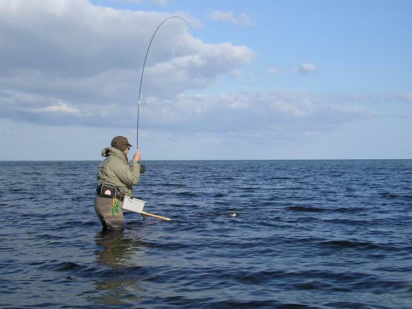 Vorsichtig und mit zittrigen Händen brachte ich die Flugschnur aus, platzierte meine Garnelenfliege an den Rand des Jagdgebietes und begann zügig mit dem Einstrippen. Im nächsten Augenblick sah ich eine Bugwelle hinter meiner hoch geführten Fliege und Sekunden später spürte ich ein deutliches „Festhalten“. Mein Straffen der Schnur kam ohne zögern. Der Fisch floh in Richtung des Strandes und mit schnellen langen Schnurzügen |