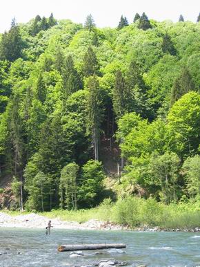 Weite Würfe sind nicht erforderlich - bei dem reißenden Wasser hat man eh schon Probleme nur das Vorfach und ein oder zwei Meter Schnur auf der Wasseroberfläche zu kontrollieren. Die Rute sollte nicht zu kurz sein, da man sicher dankbar ist, den einen schnellen Strömungsstrudel direkt vor einem bequem überbrücken zu können. Vorfachscheu sind die Fischlein auch nicht, ein 6lbs-Vorfach ist genau das Richtige. Diese Strecke erfordert etwas Trittsicherheit beim klettern am Ufer und durch den Wald. |