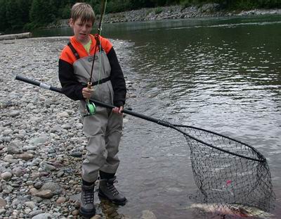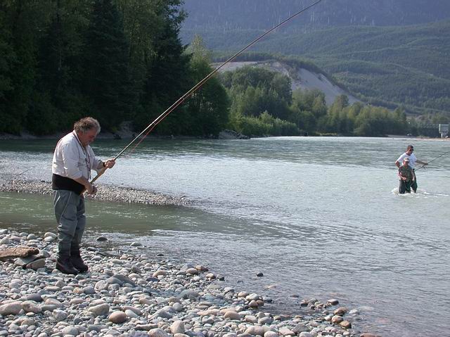 | Wie bei jedem Angelurlaub gibt es auch Kurioses. Es ist kein Anglerlatein: ein Buckellachs nahm die Fliege von Uwe und beim Drill biss er noch in die Fliege von Kai. Auf der Kiesbank gelandet, mussten die Leinen entwirrt und die Fliegen zugeordnet werden. Der Lachs bekam seine Freiheit. 95% aller gefangenen Fische wurden released. Der 11-jährige Kai fing in diesem Jahr seinen ersten Hundslachs mit 15 Pfund an der Fliegenrute. |