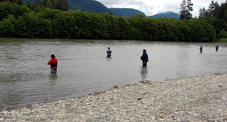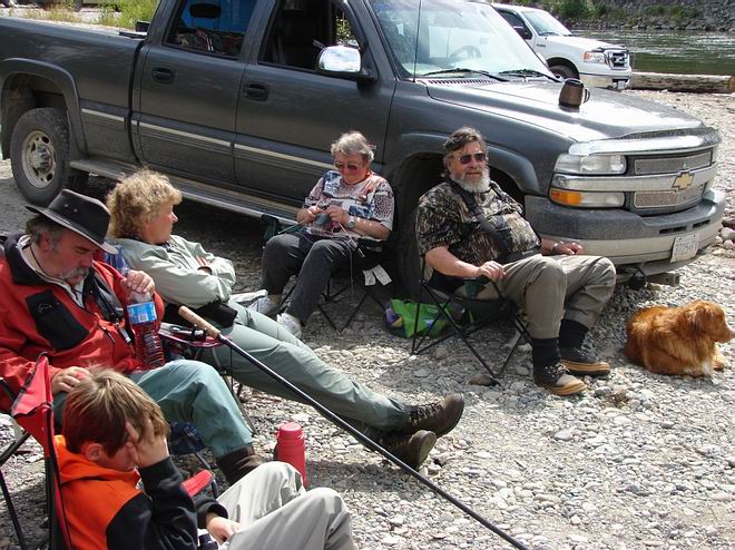 Ab jetzt waren wir eine kleine Gruppe: Uwe mit Sohn Kai, Willy und Marianne mit zwei Hunden, meine Frau und ich. Endlos kamen Lachse in den Fluss, ich denke der Grund war der immer gleiche Wasserstand. Oft hatten wir gleichzeitig an jeder Rute einen Fisch und jeder kam auf seine Kosten. Es war ein Naturerlebnis der einmaligen Art. Die Aussage eines Indianers vor 24 Jahren war: “In einem guten Jahr, wenn die Lachse ziehen, kann man trockenen Fußes den Fluss überqueren.“ In diesem Jahr wurden wir Zeuge dieses Naturschauspiels. Oft standen ich und meine Frau im oder am Wasser, gleich dem Schäfer in einer Schafherde, vergaßen das Angeln und schauten den ziehenden Lachsen nach, welche vor und hinter uns durchzogen. |