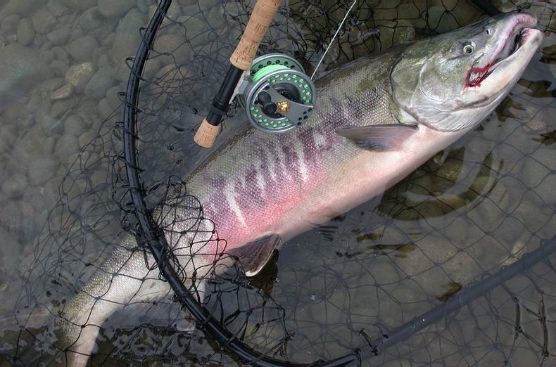 Wir zogen unsere Watkleider an und begannen einen Weg zu suchen, um weiter zu kommen. Nach 2 Stunden begann der Fluss zu sinken, so das Ingrid im überfluteten Teil eine Stelle fand, welche ich mit dem Auto durchfahren konnte. Alleine und ohne Gedränge konnten wir Fliegenfischen. Das Kitimatwasser war braun und stark reißend. So mancher Baum kam den Fluss herunter geschwommen. Zu meiner großen Überraschung bissen die Lachse trotzdem. Meine gängige pinkfarbene Fliege habe ich mit Glitzer Flasch aufgepeppt, damit sie im trüben Wasser sichtbarer war. Der Fluss war voller Fische. Der Königslachs war 14 Tage später dran, der Buckellachs war voll im Run und vereinzelt kamen die Hundslachse. |