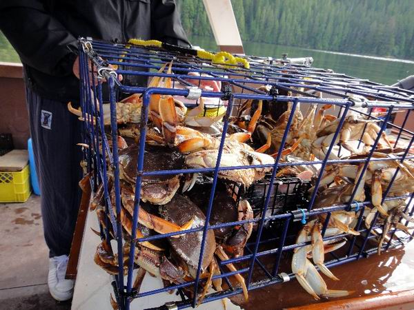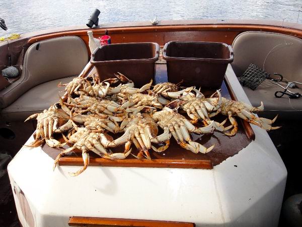 Der Korb ist voll und mit Vorsicht werden die Krabben aussortiert. Weibchen und zu kleine (mit einem Messgerät wird die Größe festgestellt) werfen wir ins Meer zurück. Die Scheren sind sehr stark und der Biss ist schmerzhaft. |