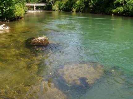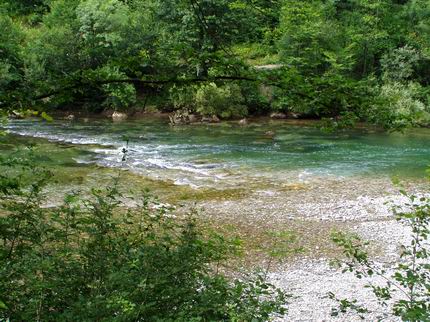 Der Kupa-Teil oberhalb Brod na Kupi bietet bildschöne Äschenzüge und gewaltige Löcher in kiesigen bis felsigen Terrain und der untere Teil strömt im großen Kiesbett breit - mal flach und schnell, mal tief und ruhig dahin - hat ebenfalls schöne Äschen, gute Forellen und Huchen, ist aber etwas schwieriger zu befischen, besonders bei hochsommerlichen Niedrigwasser, wenn das Wasser ruhig und leblos da liegt. Wenn hier jedoch ein richtiger Schlupf im Gange ist, kann man sicher 'was erleben... |