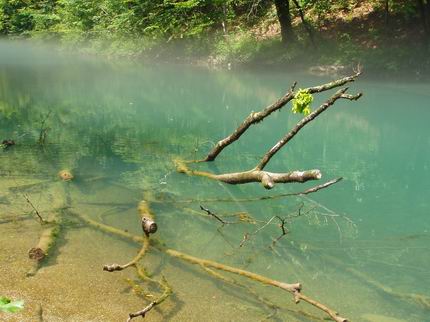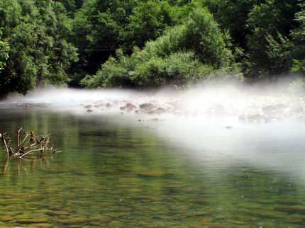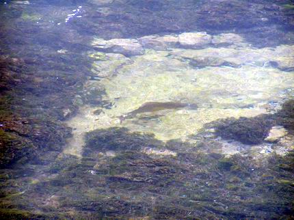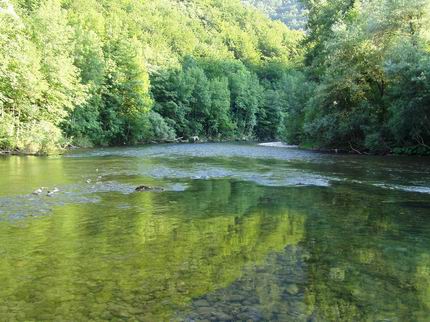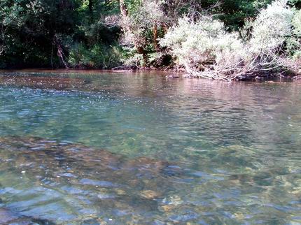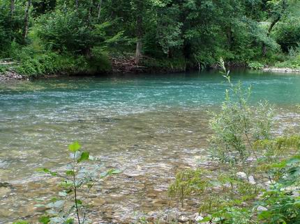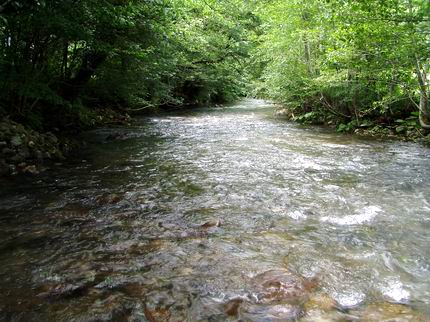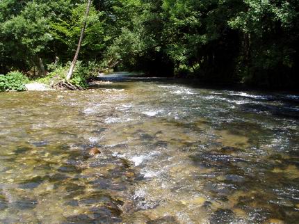 Wer auf die feinere Bachfischerei im "Baumtunnel" steht, wird den Curak lieben. Hier stehen die Fische oft an unscheinbaren Plätzen, was man auf den ersten Blick gar nicht vermuten würde. Die Trockenfliege ist hier die erste Wahl. <= Wer sieht die dicke Äsche? Ort des Geschehens: die Kupa im Nationalpark. |
