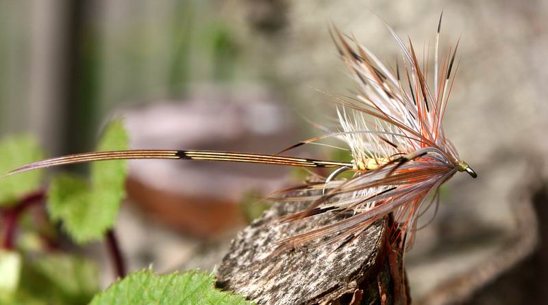 French Partridge Mayfly (verschiedene Farbvarianten) Klassische Bindeweise: Hakengröße 8, 10, 12, 2x lang z.B. Kamasan B 830, Fasanenschwanz (drei Fibern, lang), Körper Rayonbast gehechelt mit Trockenfliegenhechel, Stützhechel indischer oder chinesischer Hahn in verschiedenen Farben, Fronthechel aus Steinhuhn (French Partridge), Farbe natur, gelb oder oliv. |