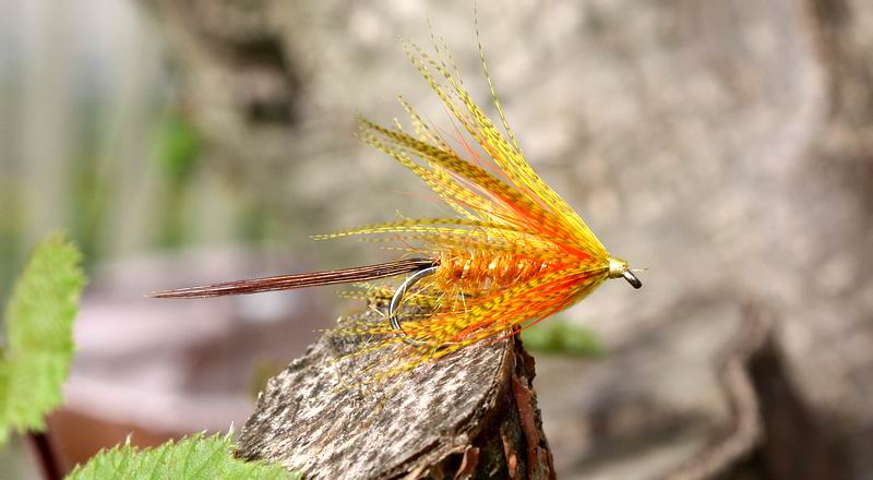 Bindeweise: Hakengröße 10, 2x lang, Fasanenschwanz (6-8 Fibern eher kurz), Körper golden- olive oder dunkelgelbes Seehundsdubbing oder Ersatz (Angora), gerippt mit mittlerem, ovalen Goldtinsel, Stützhechel Hahn oder Henne orange, Fronthechel graue oder gelbgefärbte Stockentenfeder. |